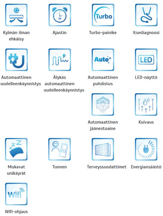 – Wi-Fi-moduuli ilmastointilaitteen ohjaamiseen älypuhelimella (tukee Androidia/iOS:ää ja Amazon Alexaa/Google-kaiutinta).