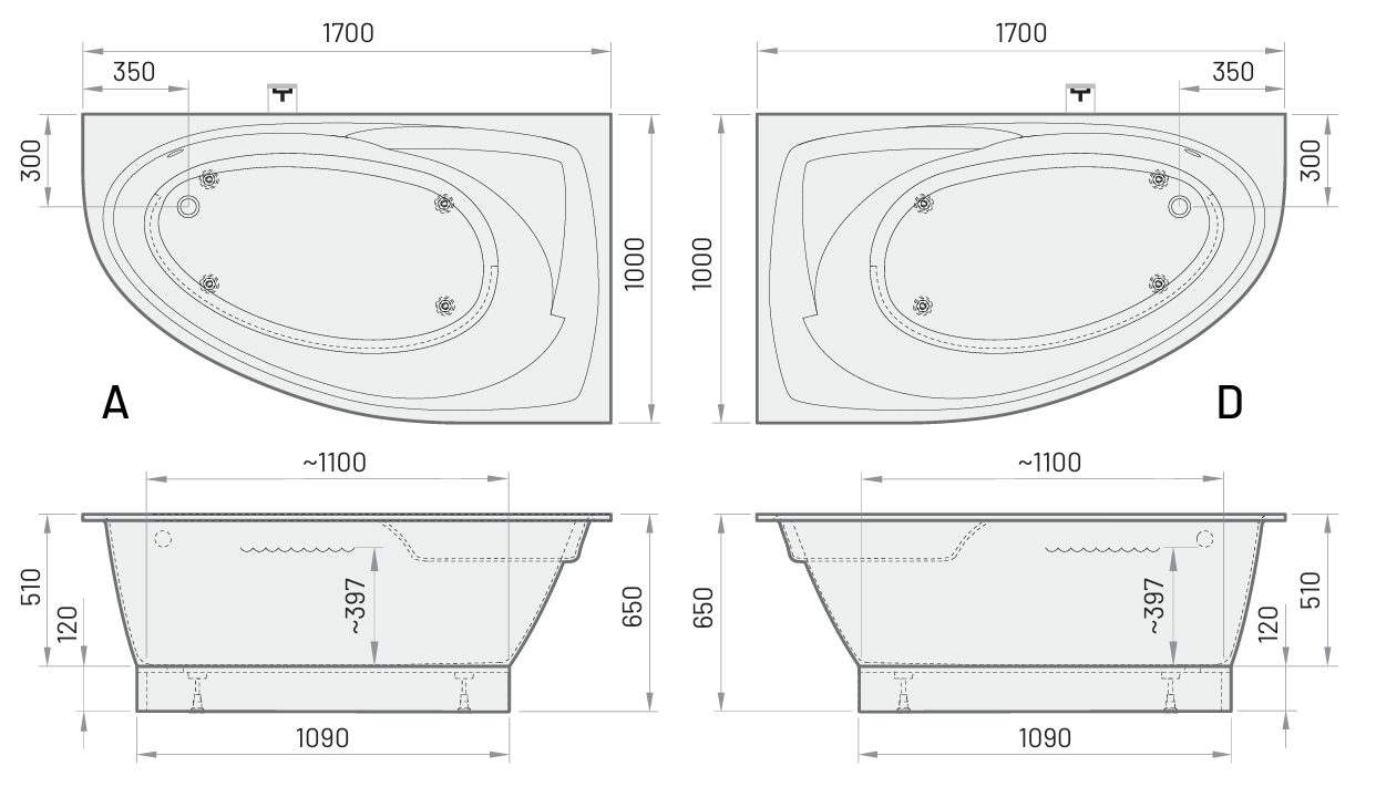 Kampinė akmeninė vonia PAA TRE 170 A/D, 1700x1000 mm, balta (VATREGR)