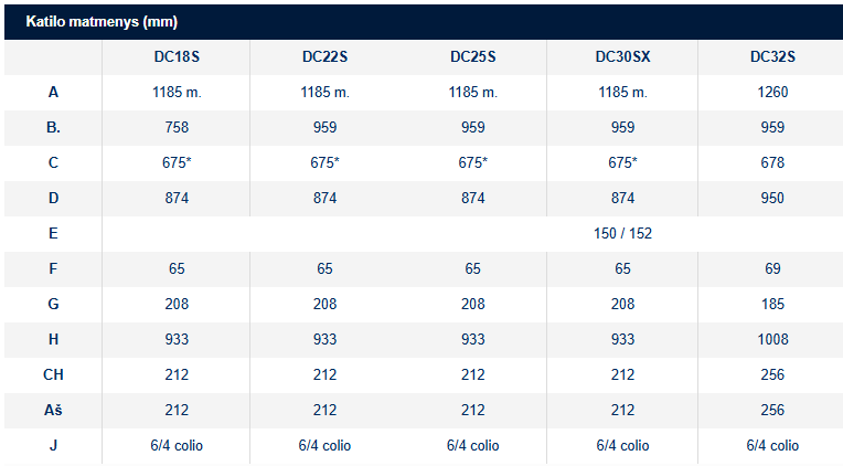 | 7. | Apsauginis termostatas | 33. | Dūmtakių dujų stabdys (DC22SX, DC30SX, DC40SX, DC50S, DC70S) |
